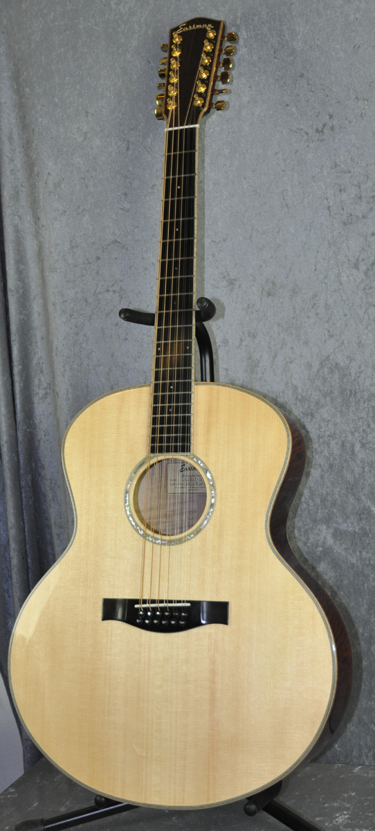 All solid woods:Handcarved highly flamed maple back, arched like a Cello! Maple sides.Selected solid ADIRONDACK Spruce top. 3-ply maple neck.Ebony fingerboard.Abalone rosette.Ebony bridge pins with pearl inlay.Handpolished solid bone nut and saddle for best tone.Flamed maple binding all aroud body and neck!! Airdried woods.Nitro finish.Eastmans Top Of line ! Sounds fantastic and great volume too. Superb.Classic back and sides, Natural top finish.Eastmans Top Of line 12 string! THE NEW KING OF 12 STRINGS! Sounds fantastic and great tone too. Superb. .
