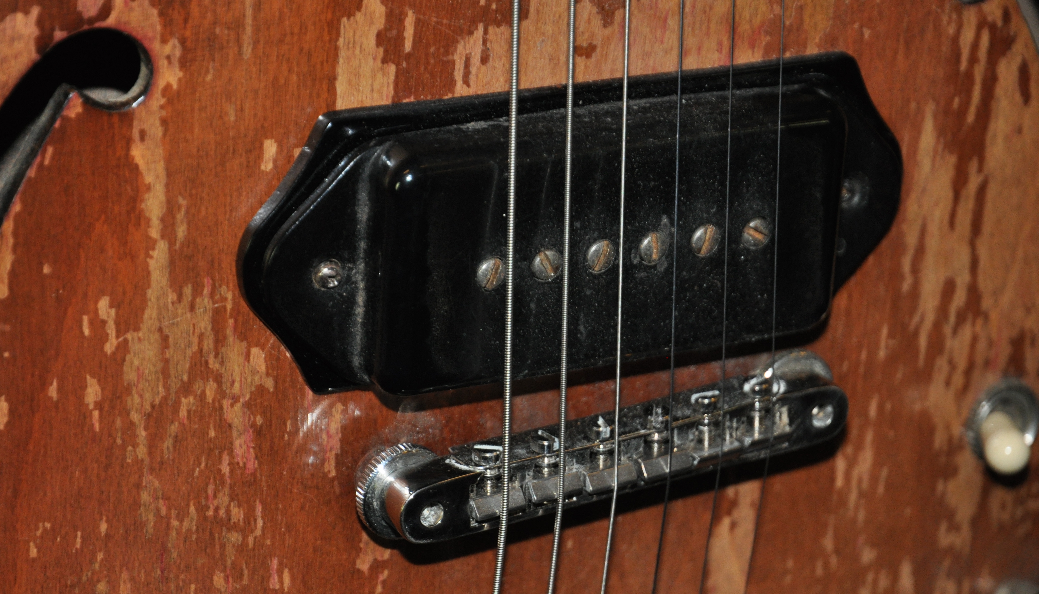 Bridge pickup shimmed to get closer to the string for more balanced volume with the neck pickup, (same idea as Gibson installed on ES-5, ES-225 and others).